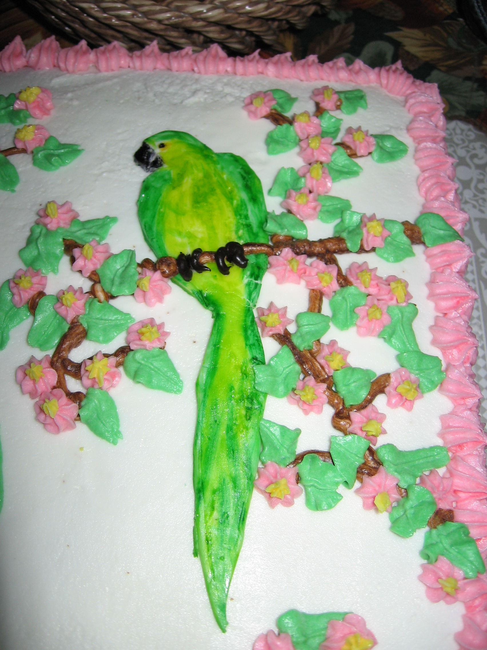 I used gel food color to paint on fondant for this cake. One of my friends wanted a birthday cake with a picture of her bosses bird on it. You can take clear vanilla extract and gel food color to paint on fondant like water colors. The clear vanilla extract will dry in just a few minutes. The flowers were also fondant made with a cookie cutter. If you can’t draw very well you can always photocopy the image you want to put on your cake. Cut the picture out and then lay it down on the fondant to get the basic shape. If the picture is more complex then cut it in sections and lay those out as guides to outline where you want to paint. This type of cake will be something that they will love and talk about for years to come.