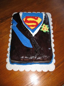 For that superman or super father who always bails you out this cake is easy to do. This is a 1/2 sheet cake that I made as a grooms cake for my daughters best friend’s wedding. The suit and tie are fondant and the shirt is buttercream. To jazz it up I painted Wilton’s black sparkle gel on the suit jacket. The flowers on the jacket are also out of fondant to match the bride bouquet.