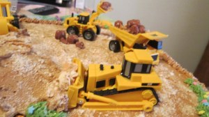 There is nothing better for boys of all ages then a construction site cake. This is without a doubt the easiest cake to make. When you level your cake put the pieces you had left over and build up one side and frost with tan icing. To make dirt take some Nilla Wafers put them in a ziploc baggie and pound them into nothing. Sprinkle the dirt over the icing while it is still moist. The rock I made out of little pieces of Tootsie Rolls. Add some little construction vehicles and you are finished.