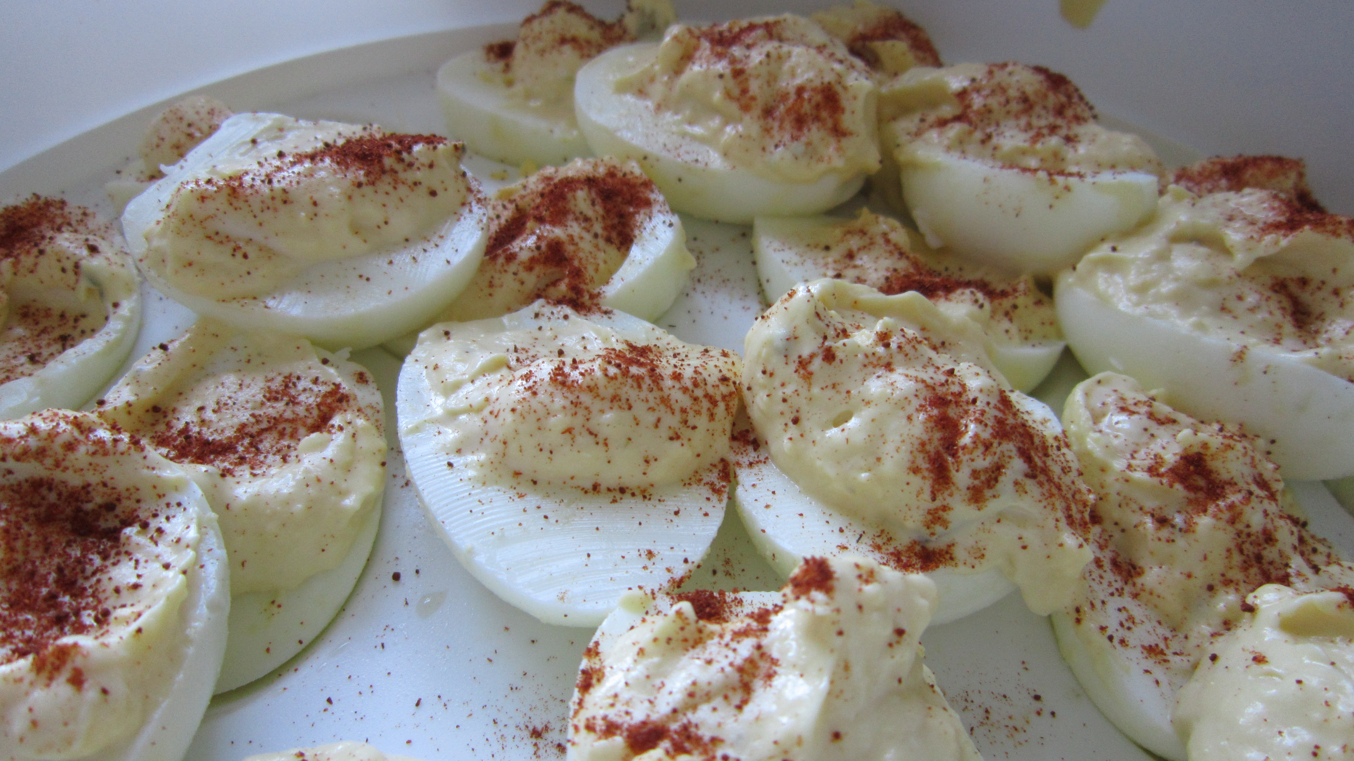 Cut your hard boiled eggs horizontally. Take out yoke and blend with; 1 tbsp of Horseradish, 1 tbsp of Pickle Relish, 2 tbsp of Miracle Whip, Dash of Salt. Spoon in mixature and sprinkle with Paprika.