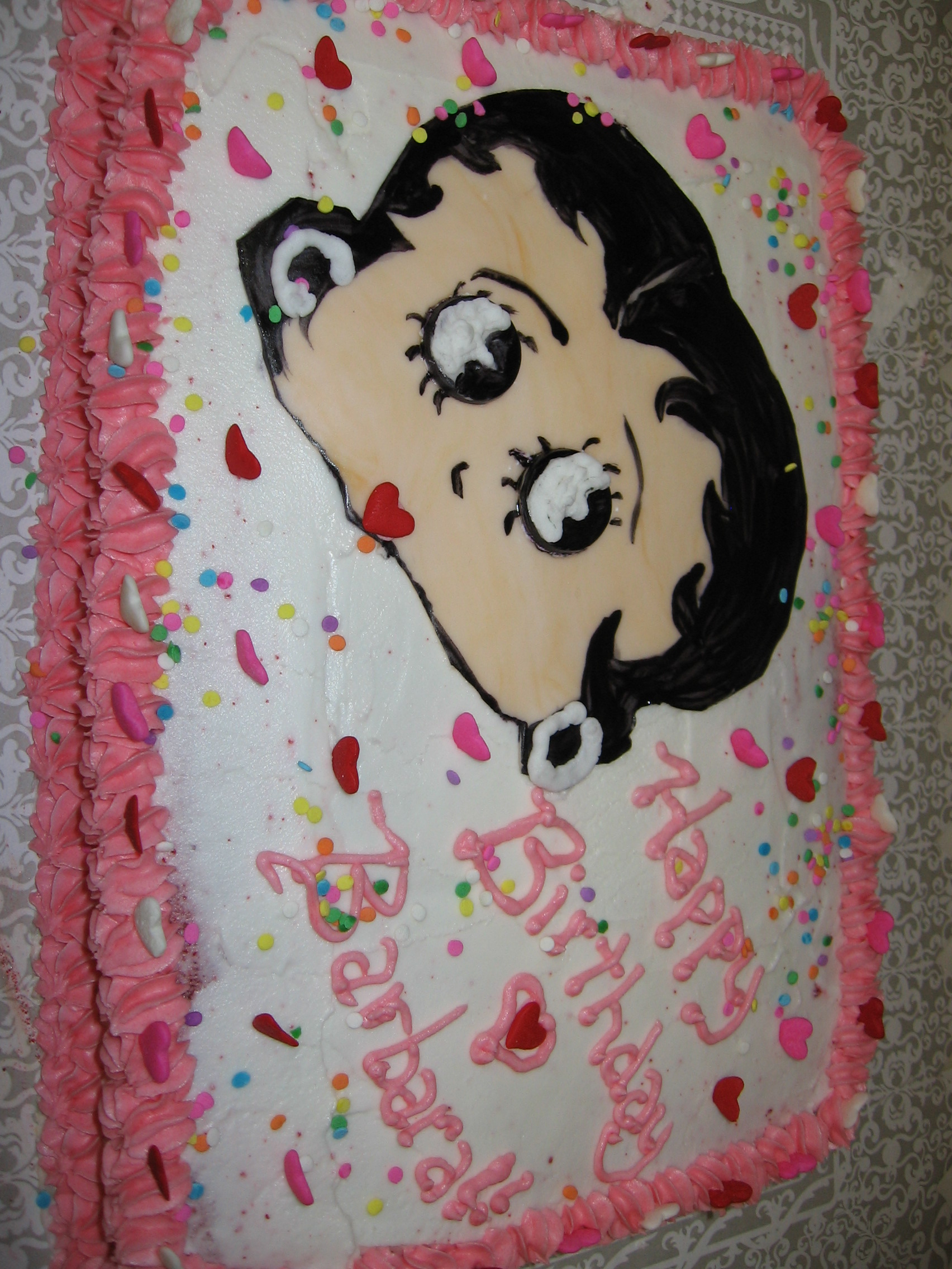 Betty Boop is hand painted on fondant. If you are not a good artist you can still pull off a cake like this. First find the picture you want to make. Cut it out and lay it on the fondant. Cut out the basic shape. Then cut the individual parts of the cake, eyes and hair separately. Place them on the fondant and with a diluted solution of coloring gel and clear vanilla extract draw in the lines. Now all you have to do is to fill in the blanks. Think of this like a coloring book image. Adds some festive sprinkles are your are all set to surprise everyone with your cake.