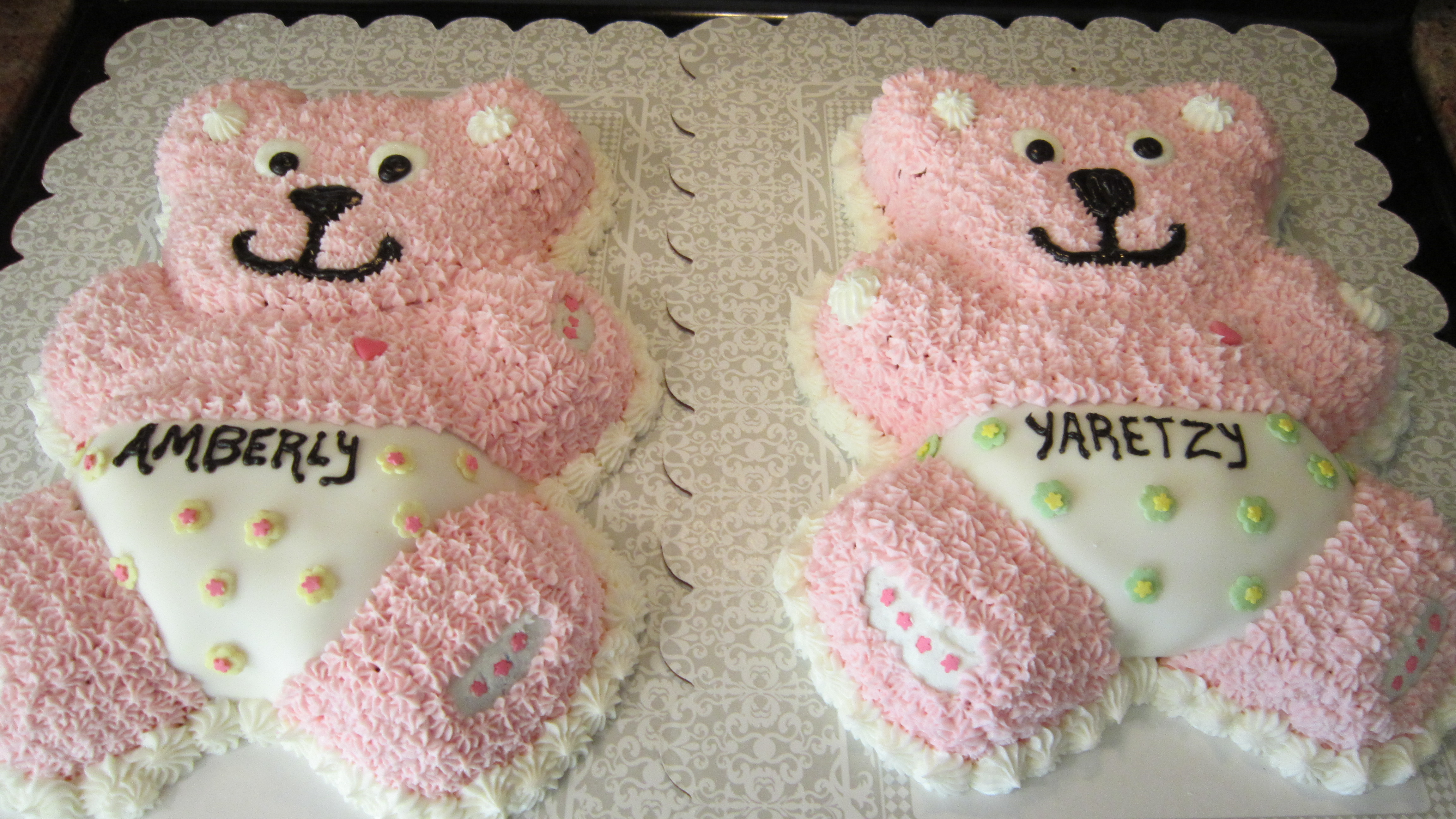I made these yesterday for a baby shower at work. Twin girls that is brave parenting. I could hardly keep up with my kids and they were 3 1/2 years apart. The bear cake pan you can pick up at Michaels or JoAnn’s. Frost the area under the diaper with buttercream first then lay white fondant over the area. I added little flower sprinkles to the diapers. I made one large batch of buttercream and colored it light pink so that both bears would match.