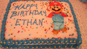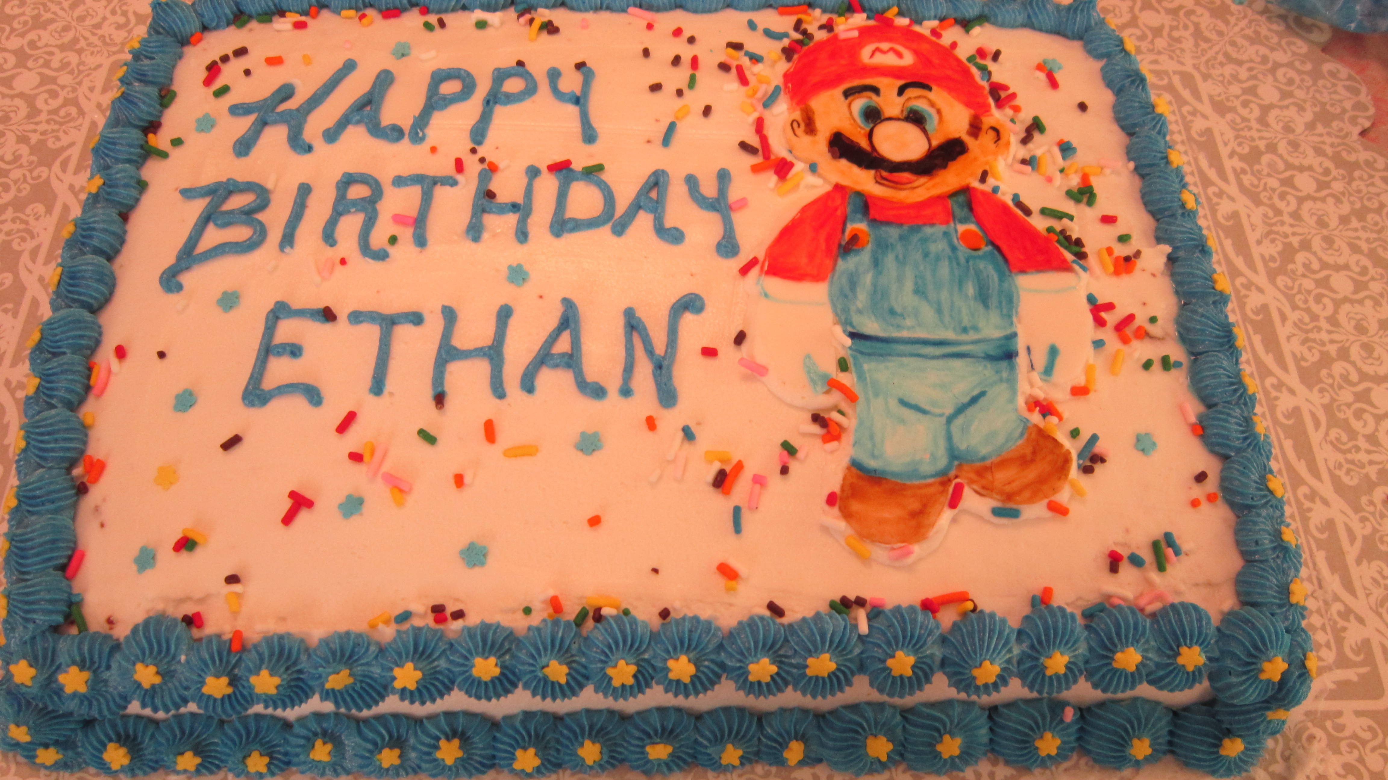 Mario is hand painted on fondant using clear vanilla extract and gel food coloring. Add some festive sprinkles and you are finished.
