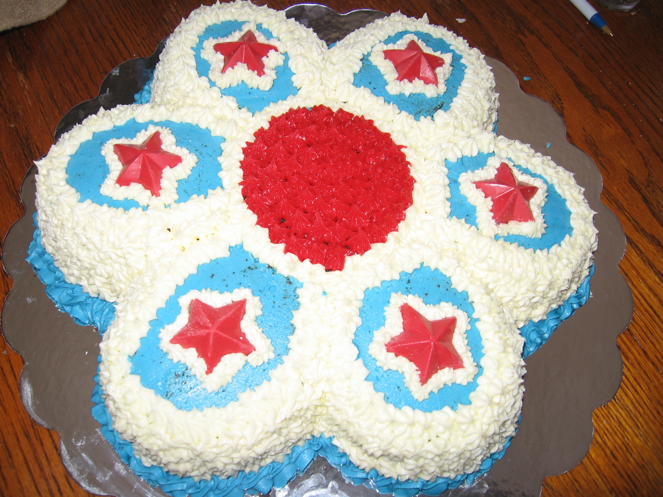 This will brighten up your holiday celebration. Use the flower plan and star tip. The red stars are made with candy melts. You can get the flower plan and the candy mold at Michael or JoAnn’s craft stores.