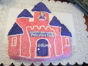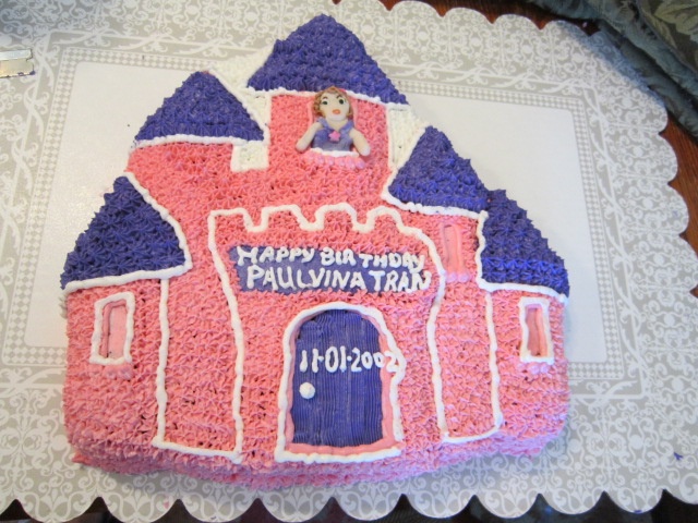 This is great for any princess party. The pan you can get from JoAnn or Michaels. Add a princess in the top tower. I made her our of fondant and hand painted the face with food coloring gel and clear vanilla extract.
