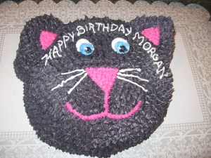This is a fast and easy cake. The pan is from Michaels and you can make several different animals with the same pan, bear, pig, giraffe or cat. If you want to make black icing take milk chocolate icing in the little plastic tub from the store and add black food coloring gel. If you add black gel to a normal buttercream you will get a gray or have to use so much that all your guests purple lips, which might be fun at a party.