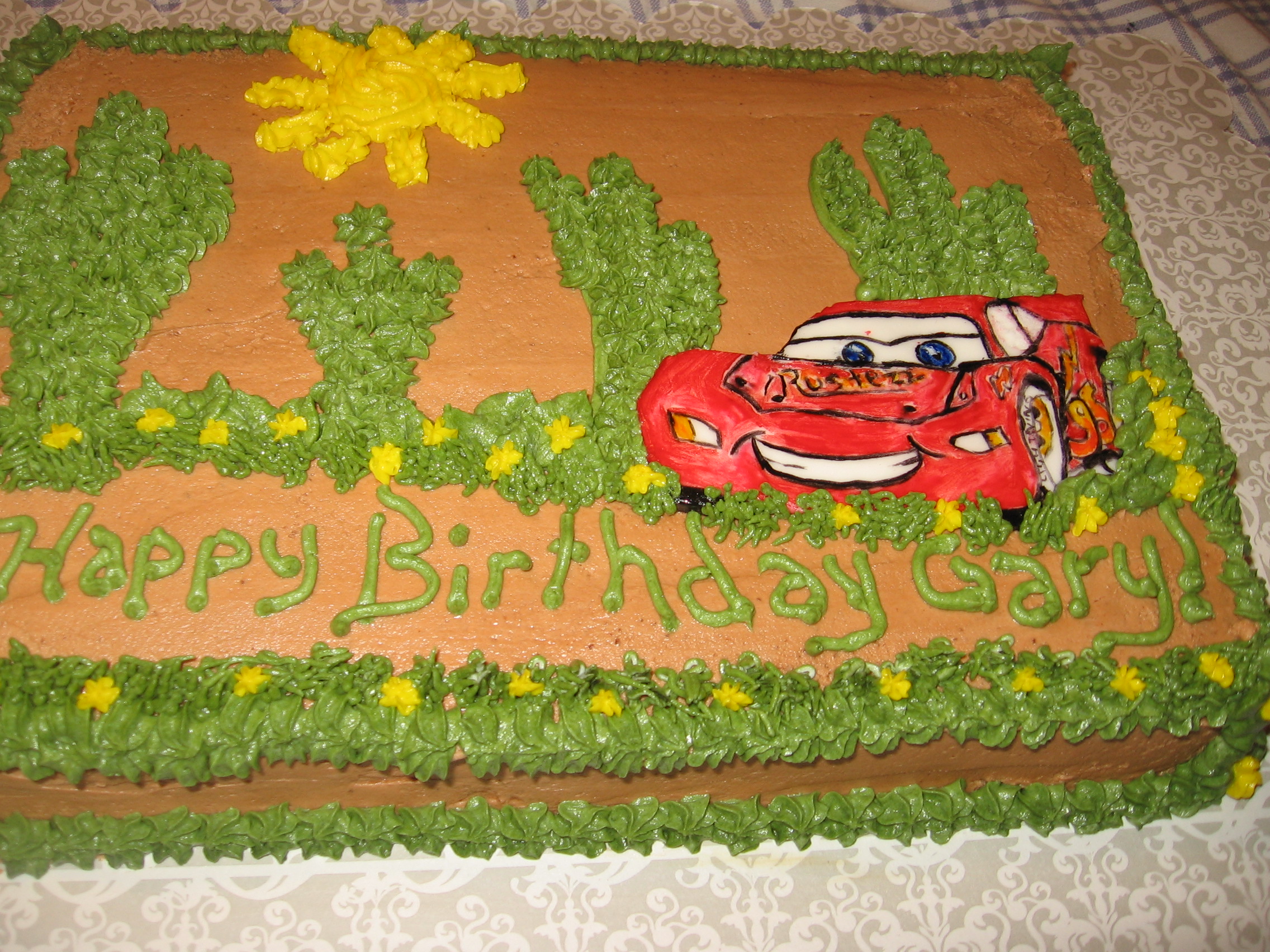 Lightning McQueen is hand painted on Fondant with clear vanilla extract and food coloring gel. If you need help in drawing Lightning try to find a coloring book picture and cut it out, photocopy and size the picture to fit in the cake. Take the picture and lay it over the fondant to get the general shape. With a toothpick gently go over the lines so that you get the general details. Invest in a detailed paint brush that is food safe. Paint in all of the colors and leave the black outlining to the last. Ice the cake and lay the fondant painting on the cake then decorate around it. This cake I used a buttercream frosting and added 1/4 cup of Hershey’s Cocoa Baking Powder and 2 tbsps of Chocolate Extract for the brown frosting. The cake was a hit and they removed the painting to keep before cutting the cake.