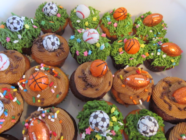 If your children are into sports and like to help decorating cupcakes, these are fast and easy. I used a grass tip for half and just picked which sports ball to add on top. The sports balls are chocolate I purchased at Party City. I made my own buttercream icing used gel food coloring for the grass. The other half of the icing batch I added two tbsp of chocolate extract and 1/4 cup of Hershey Cocoa powder to change the flavor to chocolate for the rest of the cupcakes.