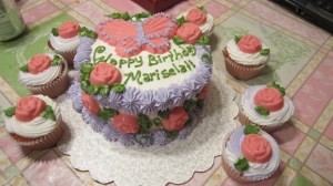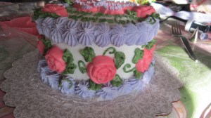 This 6″ cake is decorated with candy melt roses and the top of a butterfly box also made out of candy melts. The rose candy molds you can get from Michaels or JoAnns. The butterfly box mold I purchased through Kitchen Kraft.