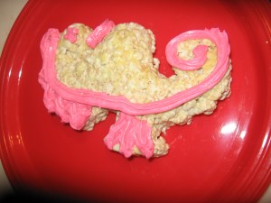 I used a sea horse sand toy (it had never been touched by sand), spray the plastic mold with pan butter flavor cooking spray and press the rice krispy into the mold. Put it in the freezer for 10 minutes then you can take it out and decorate it with some icing.