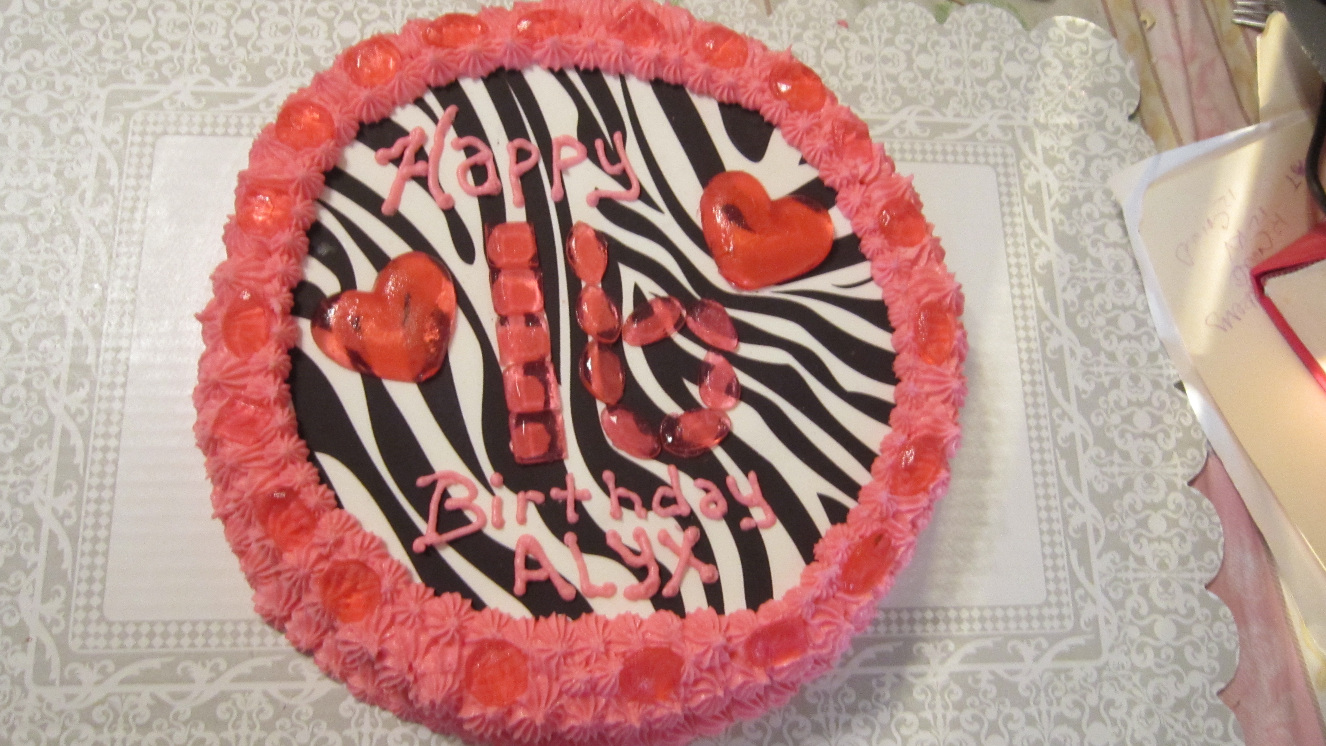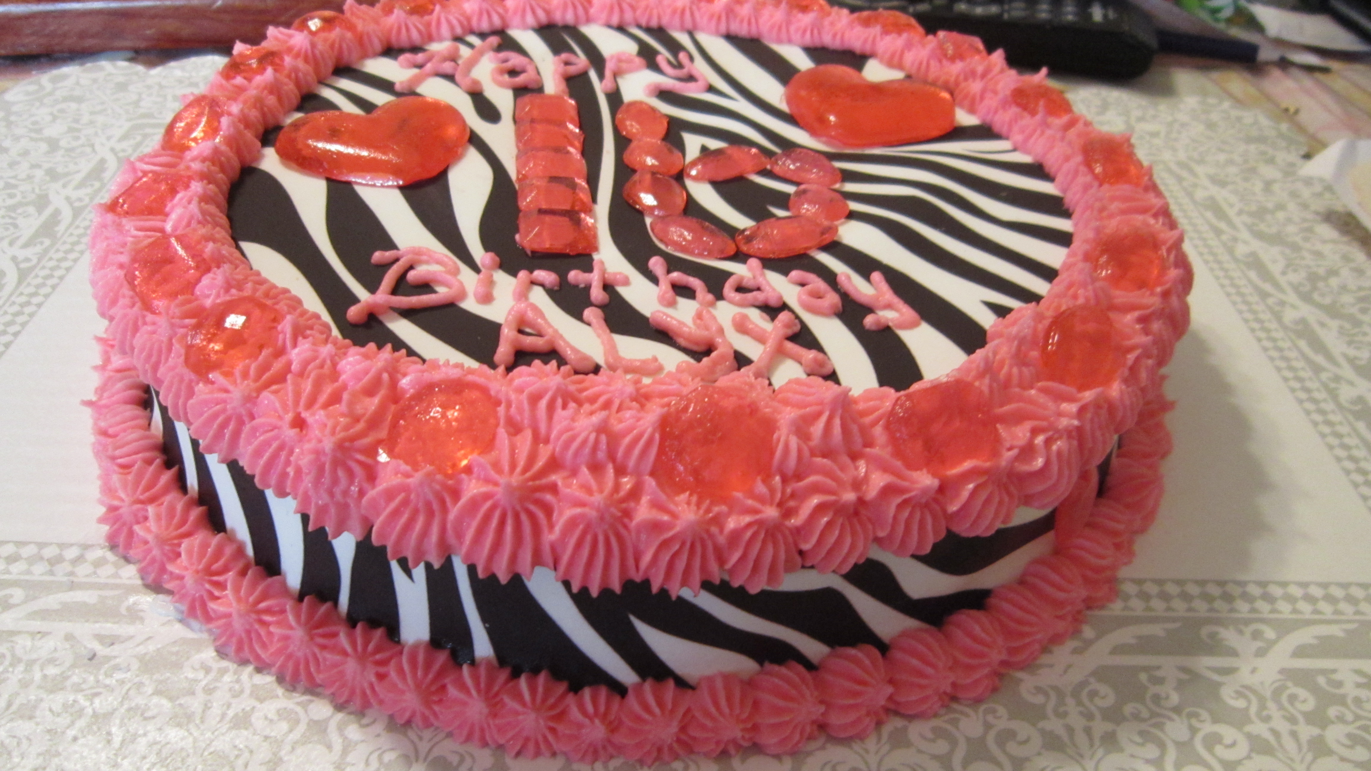 One of my friends daughter is going to get a little surprise tomorrow when I deliver this one. The sugar gems were the hardest. It was my first time and I made a mess of the first two batches. The zebra print is sugar sheets you can get at Michaels or JoAnns.