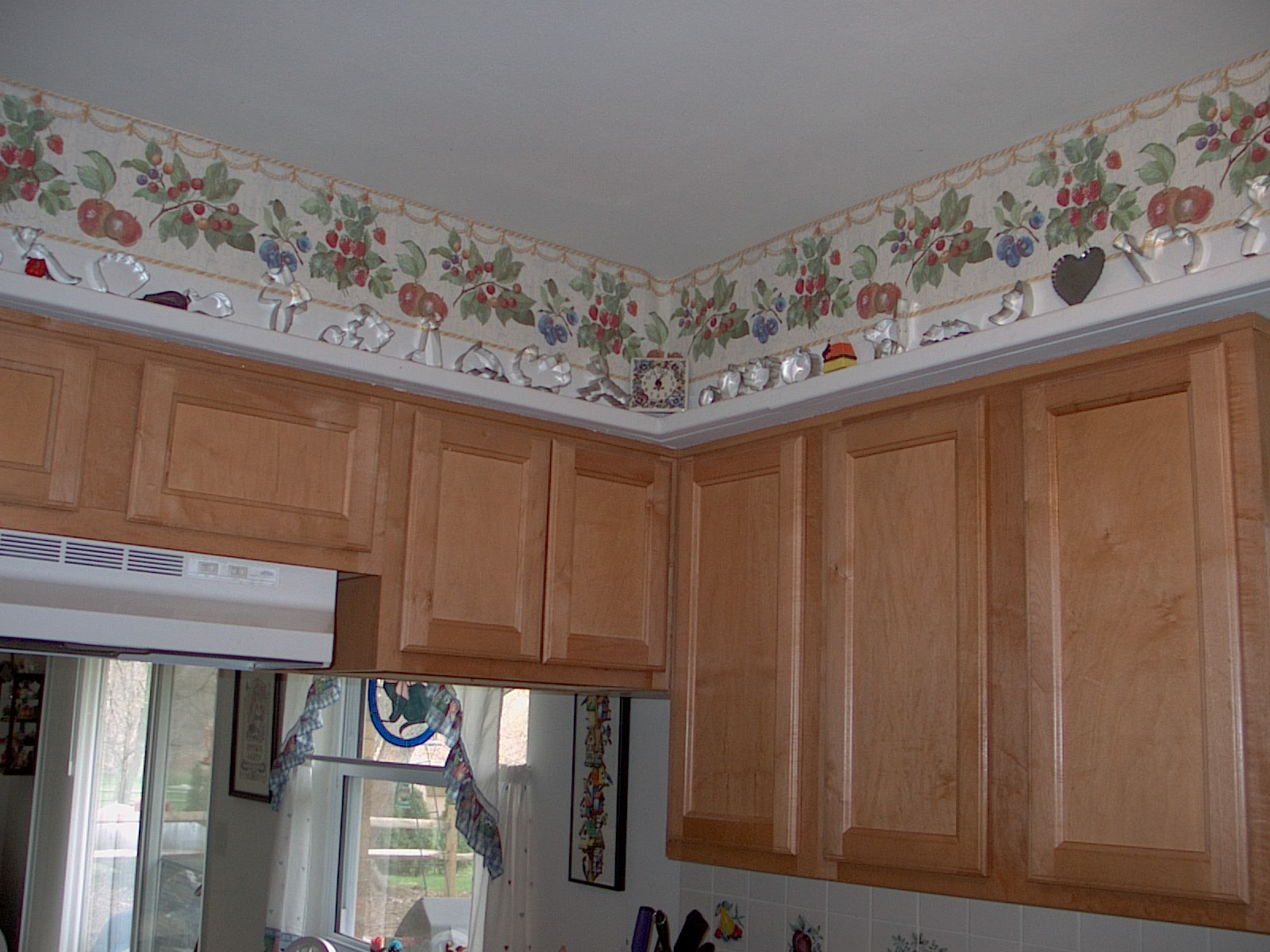 I wanted a small shelf for all of my cookie cutters. My husband put a 1’x1′ piece of wood all around the kitchen area. I painted the wood and had a great little place to display my cookie cutters.