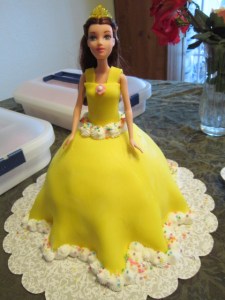 Normally when I do a Barbie cake, it is with a pick that is only the upper body and head. For this cake my friend brought the entire doll in to have a cake made from it. Since this was much bigger than the normal Barbie Cake I had to add layers to the bottom to make it tall enough. I purchased a doll stand and hot glued the stand to the cake board. Once that was secure I wrapped the legs with plastic wrap, then stood the doll up to measure how tall the skirt had to be. I added a couple of layers of cake at the bottom then the normal cone shaped cake. The legs of the doll fit inside the stand. I iced the cake with buttercream they put a fondant skirt on top to make the bottom of the dress. With the left over strips of fondant I fashioned the top then put buttercream stars and confetti where the shirt and skirt come together and also along the bottom. The doll is Bell from Beauty and the Beast and once the doll was cleaned up and dressed after the cake was cut the little girl was able to keep a little piece of her cake that will last for years to come.