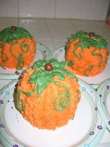 Fall has arrived and it’s time to get out the halloween pans to see what I have for this year. The pumpkins above is a over sized cupcake where the top and bottom are baked separately. Cut to even the top and bottom then ice the middle. I used a tootsie roll for the stem. Once iced add some leaves and vines and they are ready to be served. Happy Fall!