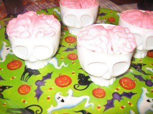 I found these skull baking cups at Home Goods store. They are make with silicone and you pour the batter directly in them to bake. Ice the brains with some pink buttercream and you truly have a ghoulish treat your guests.