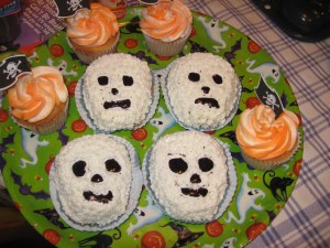 This is another pan I found at a thrift shop. It makes four of these little skulls at a time. Use black glitter food gel for the eyes and mouth. I also made some normal cupcake and did the two tone by painting one side of the piping bag with orange gel food coloring. Then you add the your white icing and you use a star tip to make the swirl on top. Add a pirate flag and you are ready to serve.
