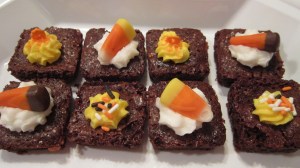 I have a silicone pan that make these little brownie bites. Add a little star of icing and top with candy corn, sprinkles or colored sugar for a fast and easy treat for all of your guest or trick or treaters.