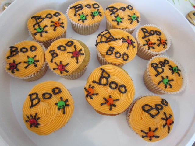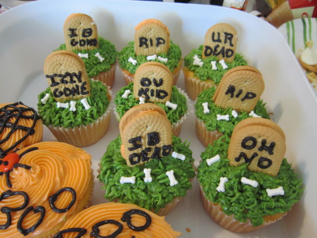 Use mini MM’s to make spiders to decorate your cupcakes. The Tombstone are made from half of a cookie. Add some funny sayings and these will be the hit of your celebration. Happy Halloween!