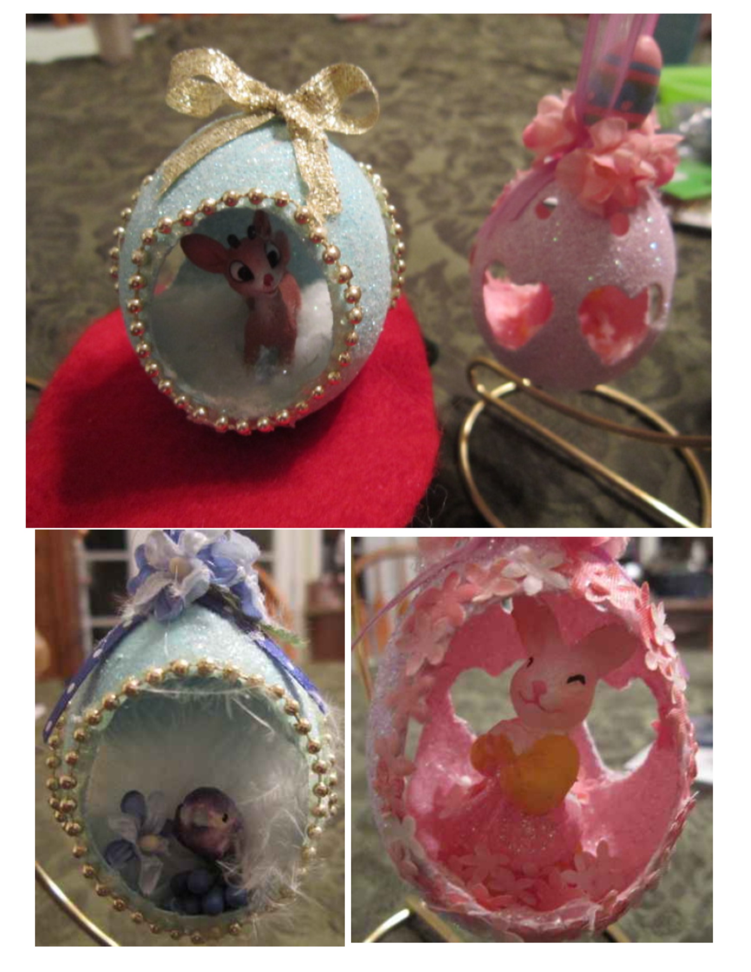 You can make beautiful ornaments out of eggs. The first thing is the crack the egg and pierce the yoke so it is easier to get out. Once out I put the egg in an antibacterial bath and let it soak for a half hour. After the egg is clean and dry paint the surface with clear nail polish. This helps when you start cutting the openings. You can use cuticle sizzors or a small drill to cut the egg. The pink egg was cut using the drill with a miniture drill bit. Once you have cut the eggs I normally will paint the eggs and let them dry then use another coat of clear nail polish to seal and give the egg strenght. Now you are ready to decorate your egg whether it is for you or these are great little gifts.