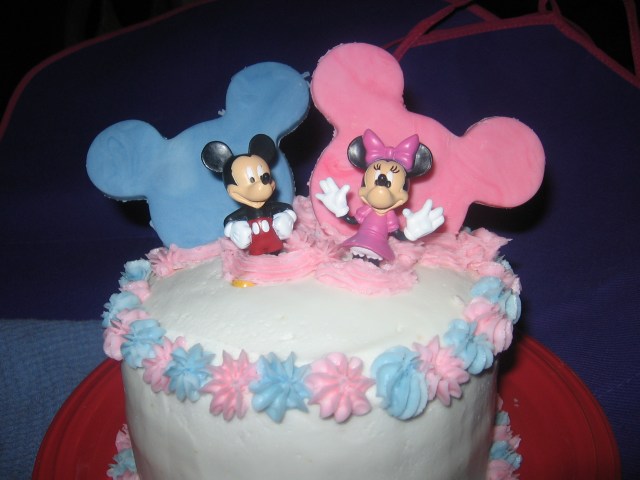 This little cake was for a birthday party with a Minnie & Mickey Mouse theme. I made the pink and blue mouse background out of fondant with a skewer inserted and left to dry before they were inserted.