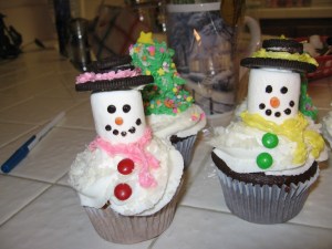 These little snowmen cupcakes are fast and easy to do. A marshmellow as a head, put a dab of icing on the top and one oreo cookie on top with a mini oreo on top of that to make the hat. Use icing to make the band of the hat and scarf. the buttons are mini MM’s. Pipe in the face and these little snowmen are ready to party!