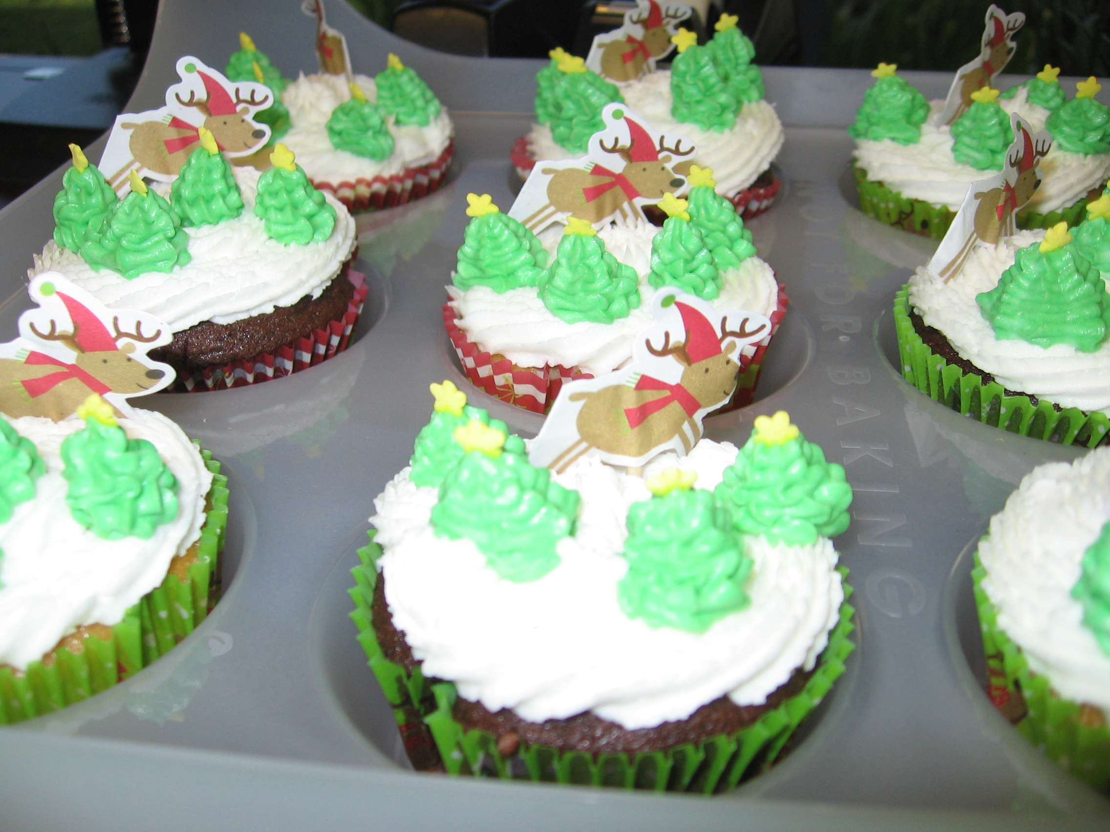 The reindeer pick I purchased at Hobby Lobby along with the baking cups. To make the little Christmas trees use a star tip and pile one on top of the other each getting a little smaller. The star at the top was for some flower confetti.