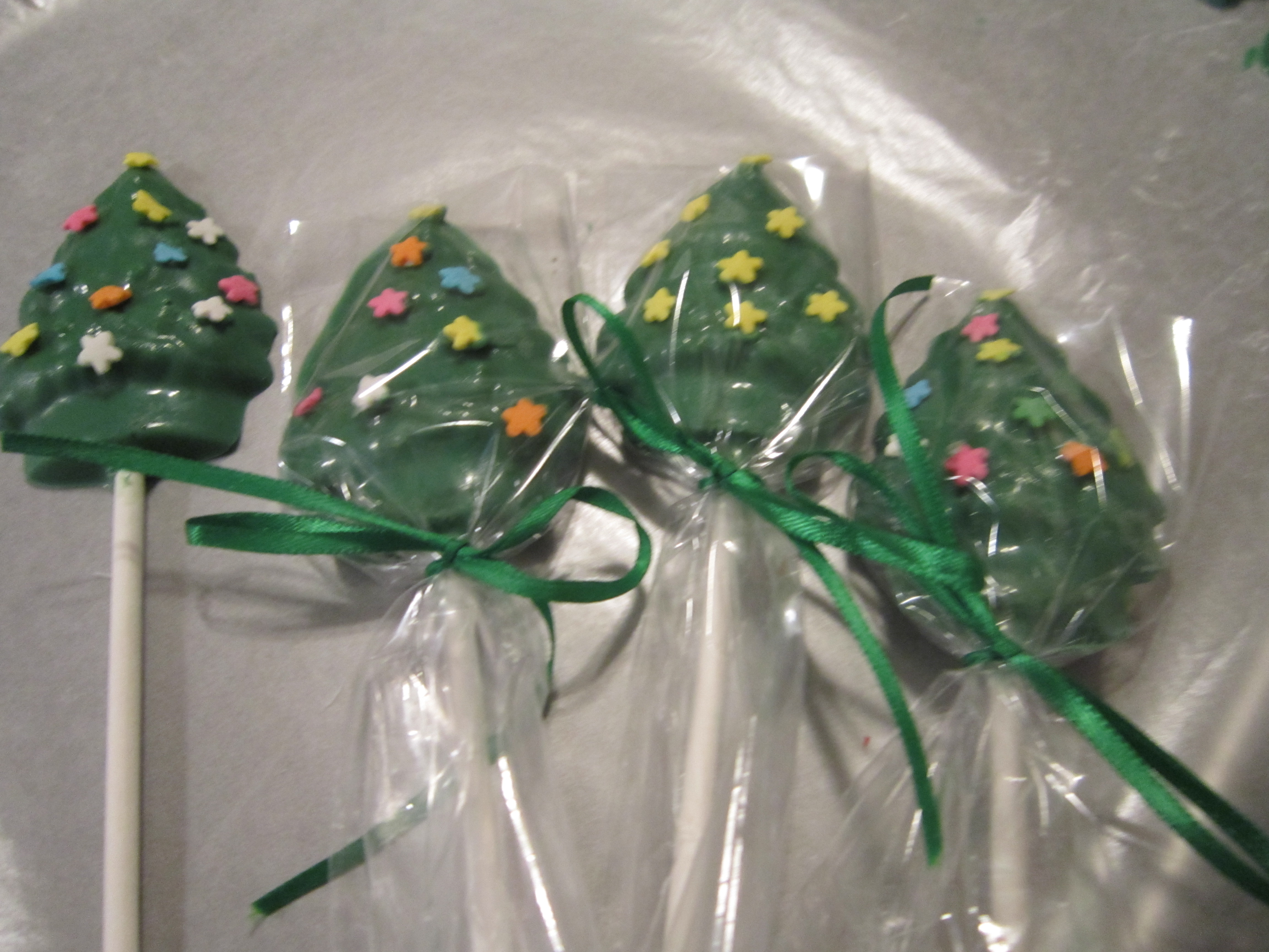 One week to go before the next charity holiday bake sale. Time to get busy. These sucker molds don’t take any time at all to make. Decorate the trees with some star confetti sprinkles and these treats are ready for the bake sale. They are also great for class room parties.