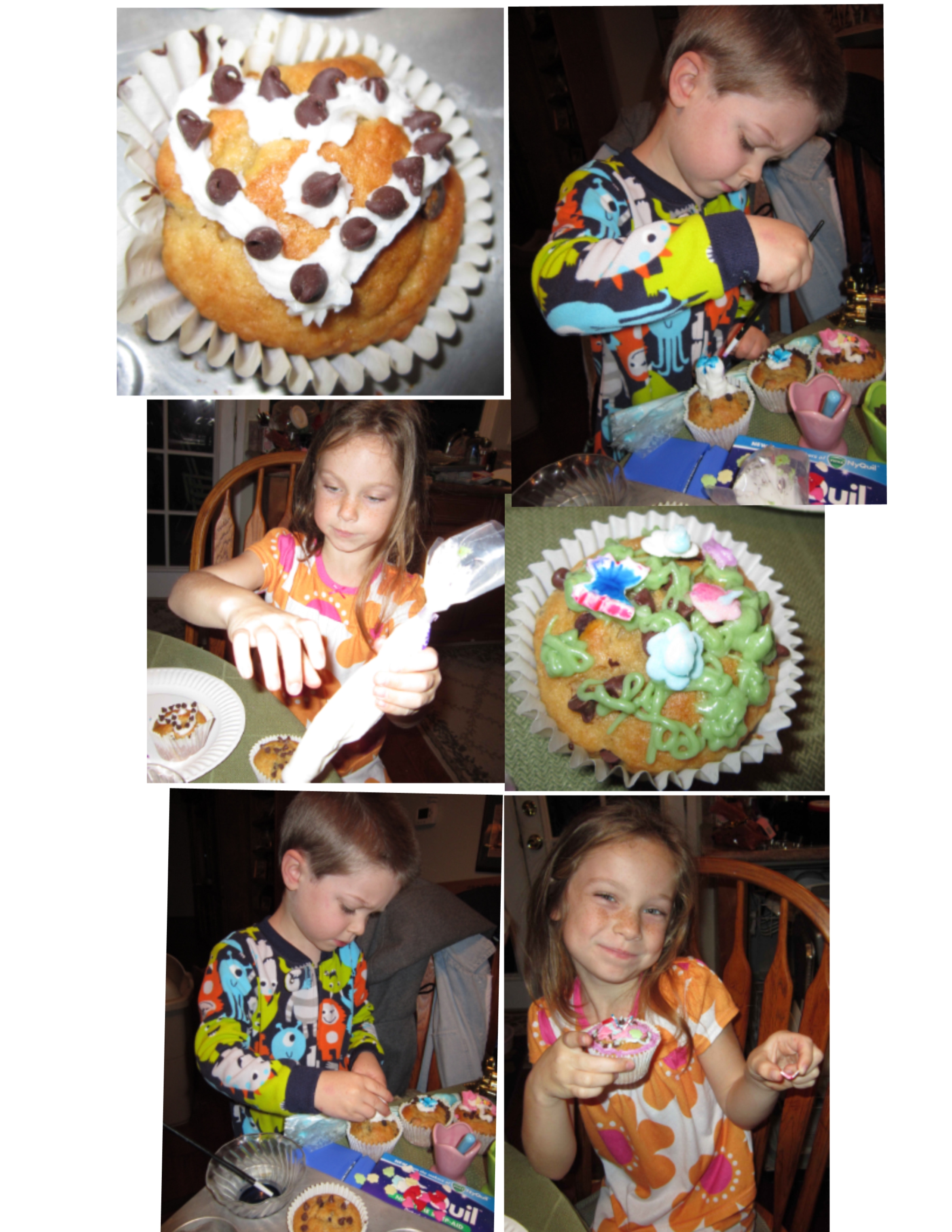 Last night I had my two grandchildren over for a slumber party while their parents went out to a play. Milena and Dorian love to decorate cupcakes and their faces fell when I didn’t bake any. I did make a batch of chocolate chip cupcakes for breakfast. They knew exactly what to do and were all of the sprinkles and piping bags were. In no time at all my kitchen was knee deep in sugar and they were having a ball. Milena found my gum paste butterflies that I had dried out for another project. I showed her how to use the gel food coloring and clear vanilla extract to paint the butterflies. She did great for her first time painting butterflies. Dorian was all about just plain white icing and tons of sprinkles on top. We all had a great time and I’m ready to go back to bed. I’ll tackle the kitchen later.