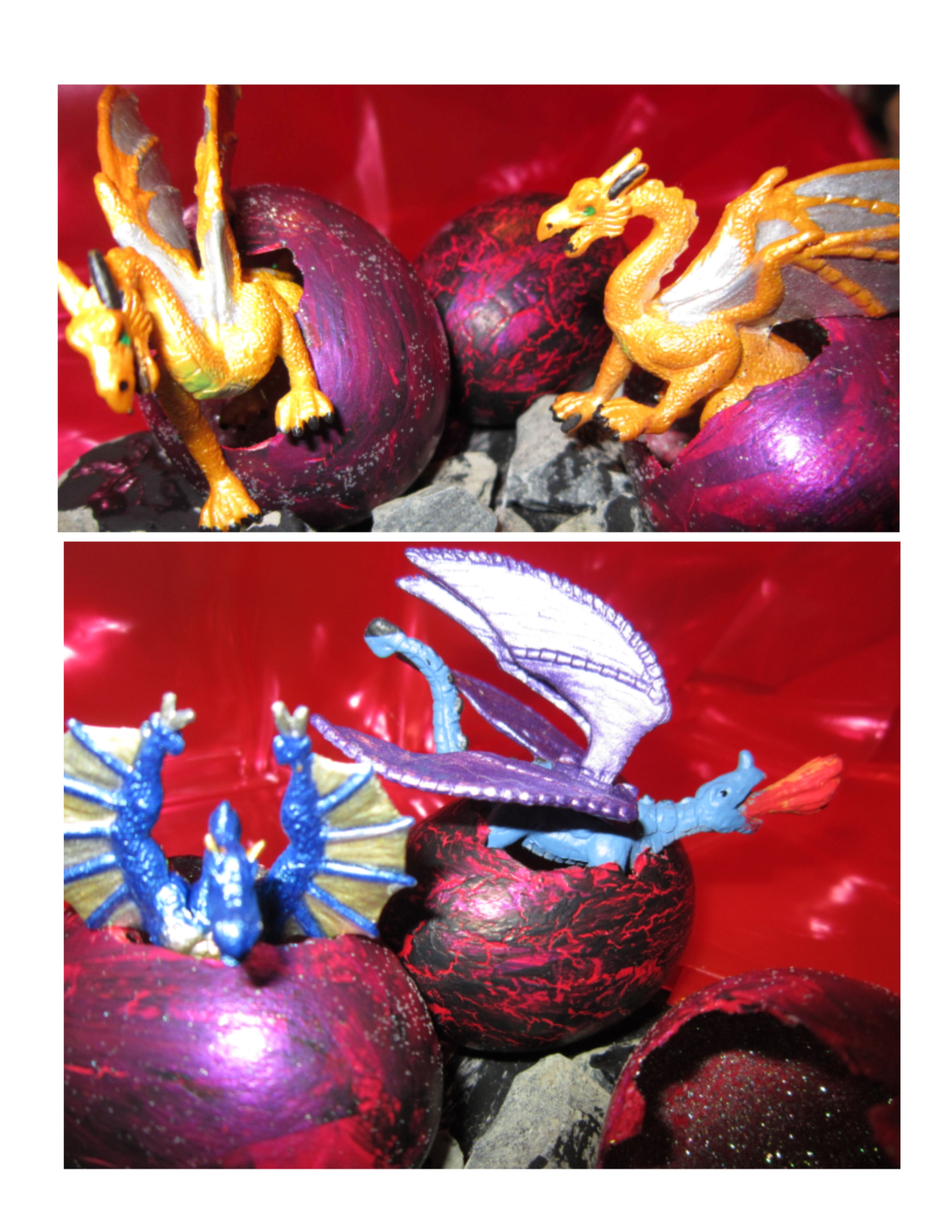 To make dragon eggs chip out a small hole and use a knife to cut the yolk. Soak the egg is an Antibacterial bath. Once the egg has dried coat the egg with fingernail polish before you start to cut the opening for your dragon. I used paint and very fine glitter on the inside and two coats of nail polish on the out side. The last coat I used crackle/shredded nail polish to give it the cracked appearance.