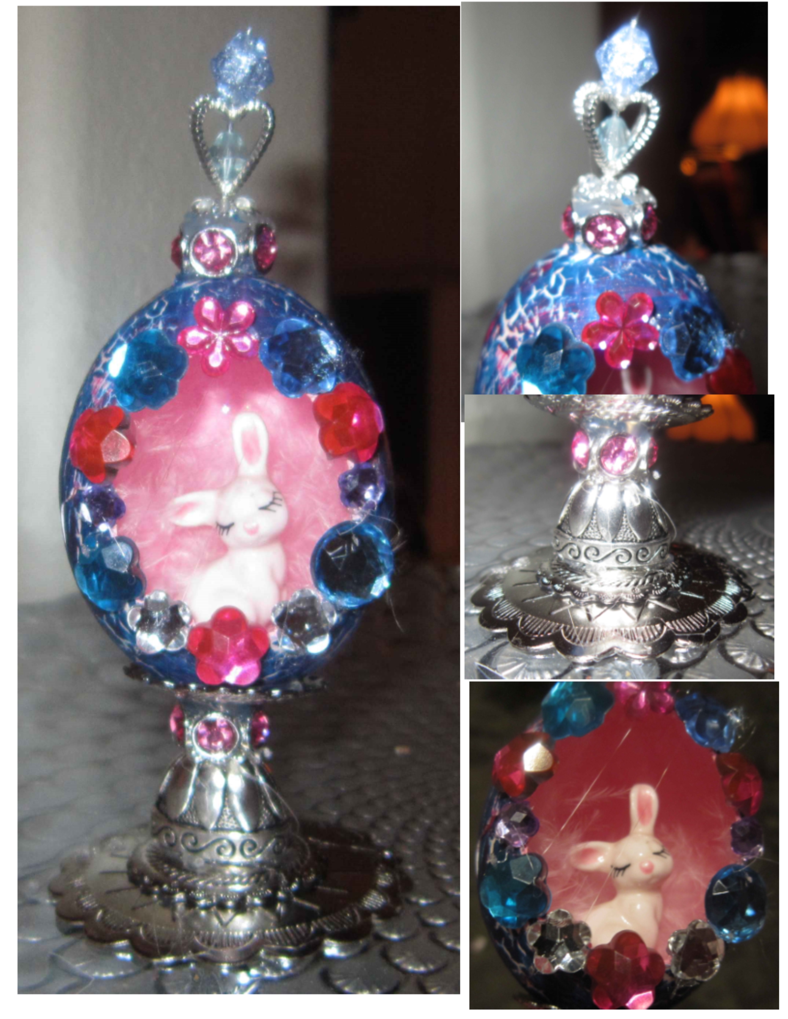 After making the egg from the kit my husband gave me for Valentine’s day I decided I could make one. How hard could that be. The parts that built the stand and top pieces I couldn’t find so I decided to build my own design. For the base you need a heavy base and I found a belt buckle and started to build up using a head pin and gluing each piece to the next until I had a sturdy base. For the inside of the egg, I put some pink feathers and the little glass bunny. I hot glued the gems around the opening. For the top piece I used a head pin to build the top and glued to the top of the egg. The egg wasn’t completely straight but my granddaughter loved it.