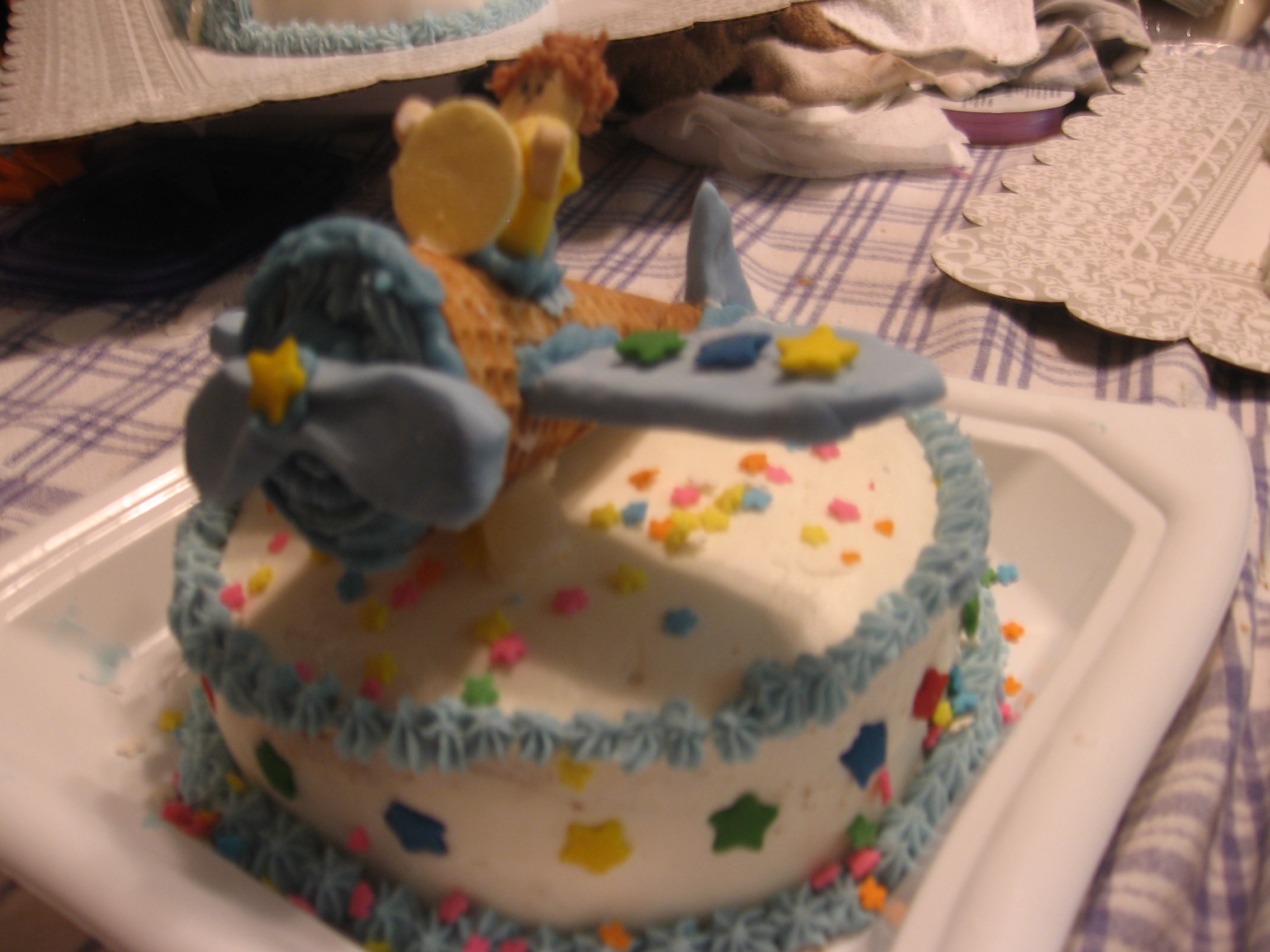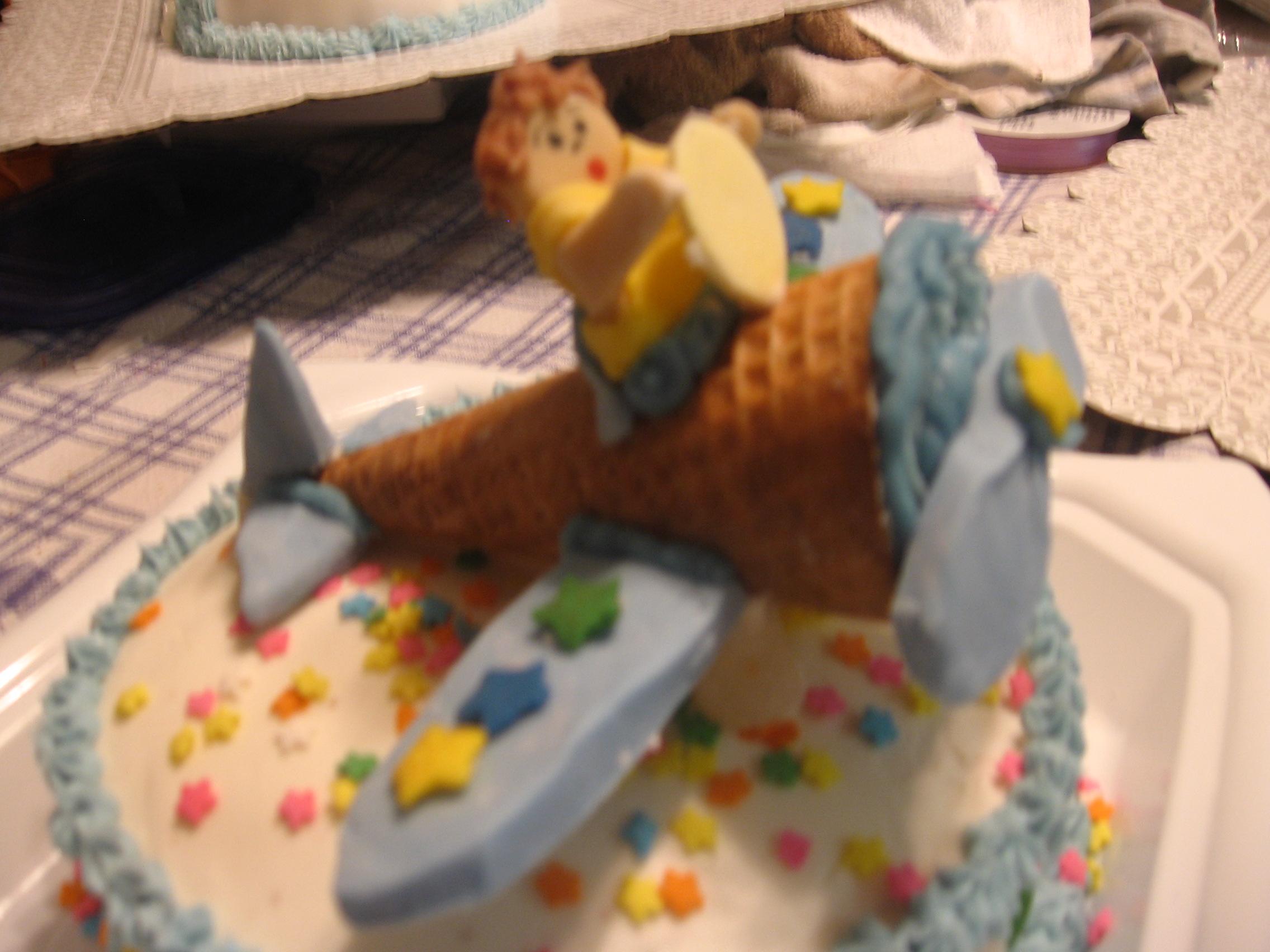 I saw this in a book and decided to try it. The wing, tail, propeller, and person are made from fondant. You can bake inside ice cream cones then frost the top. Use tooth picks to attach the wings and I put some mini marshmallows below the wings for support.