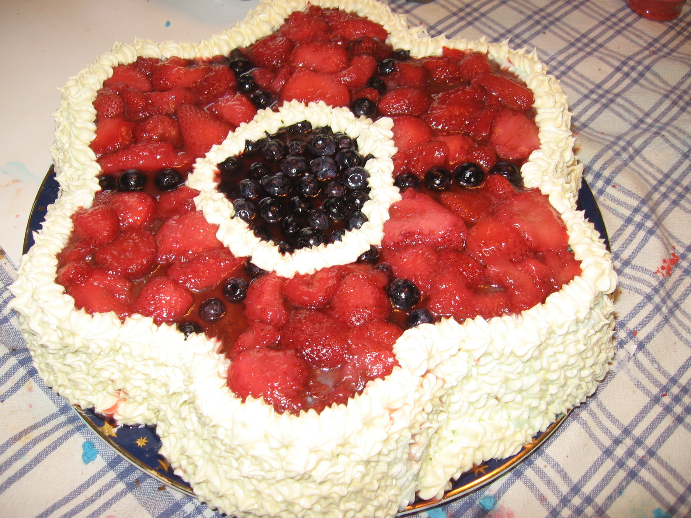 This white cake is topped with strawberries and blue berries which is perfect for any 4th of July celebration.